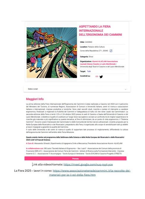 Nell'ambito della prima edizione della Fiera Internazionale dell'Ergonomia dei Cammini è stata rilevata la necessità di sviluppare un'azione formativa nei riguardi di tutte le figure che ruotano intorno al tema dei Cammini e in particolare a quelli che ne garantiscono il funzionamento, in primis gli Amministratori locali. Essi devono svolgere un po' il ruolo di regia nella costruzione del Sistema Cammini del proprio territorio e poi devono essere capaci di gestire una efficace relazione con i colleghi Amministratori con cui condividono un Cammino o un Itinerario Culturale europeo. Siccome l'impostazione della Fiera è quella della Formazione-Intervento, se nella prima edizione si è condivisa questa necessità, ci si immagina che nella seconda edizione si portino delle soluzioni e si mostrino delle buone pratiche. Per questo motivo si sono organizzati due appuntamenti nel periodo che intercorre tra una edizione e l'altra della Fiera. Il primo appuntamento è un workshop organizzato per il 19 di Giugno presso l'ISIA Roma Design a Roma. In questo workshop si è cercato di condividere questa necessità formativa con i formatori dell'AIF , con gli Ergonomi della SIE e con alcuni Amministratori locali che hanno maturato una lunga esperienza nella gestione dei Cammini. L'informativa è stata data ai presidenti di tutte le ANCI (Nazionale e regionali), diverse Regioni Italiane e al Ministero del Turismo. Il secondo appuntamento è previsto per il 10 di settembre 2025. Si tratta di un Convegno per presentare delle buone pratiche e delle prime ipotesi formative da discutere in vista della Fiera di ottobre.