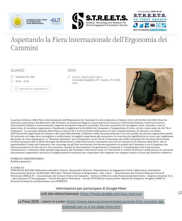 L’incontro per presentare il programma della seconda edizione della Fiera Internazionale dell’Ergonomia dei Cammini è stato inserito nell’ambito della manifestazione relativa alla Notte dei Ricercatori Europei, che si è svolta il 26 di settembre a Cassino. La presentazione è stata effettuata al Palazzo della Cultura di Cassino dal prof. Alessandro Silvestri e dal dott. Renato Di Gregorio..