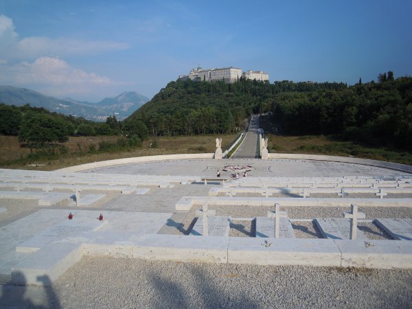 Si entra nel sacrario dopo aver letto il lungo elenco di morti, sepolti in loco. Ce ne sono 1051 e sono tutti giovani. Un semicerchio disegnato sulla collina ospita tutte le loro tombe. Il biancore del marmo delle lapidi viene illuminato ogni tanto dai fiori che portamo i parenti che vengono ad onorare i loro cari in questo luogo triste di dolore. Intorno ad ogni croce c'è annodato un rosario portato dai congiunti che hanno fatto visita e onore ai propri cari.